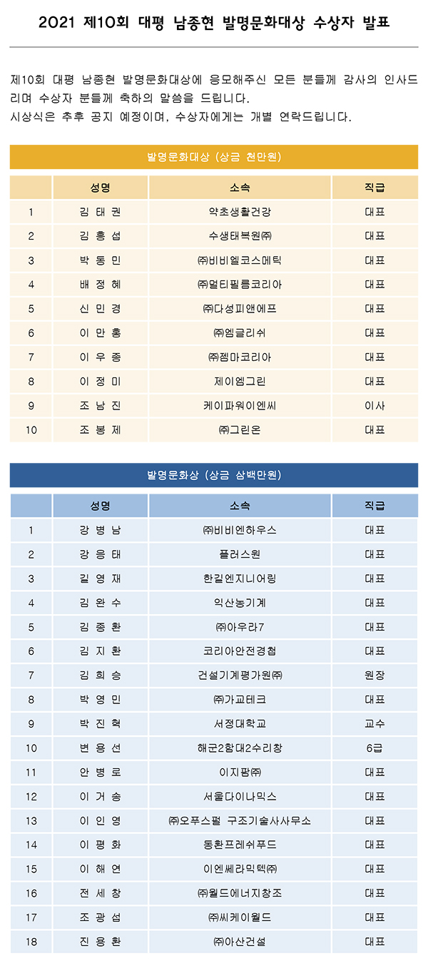 2021 Á¦10ȸ ´ëÆò ³²Á¾Çö ¹ß¸í¹®È´ë»ó ¼ö»óÀÚ ¹ßÇ¥